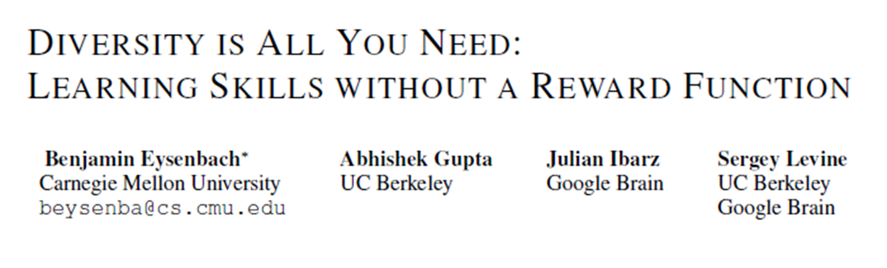 - 본 논문에서는 reward function없이 skills를 학습하는 방법으로서 DIAYN을 제안하고 있다.