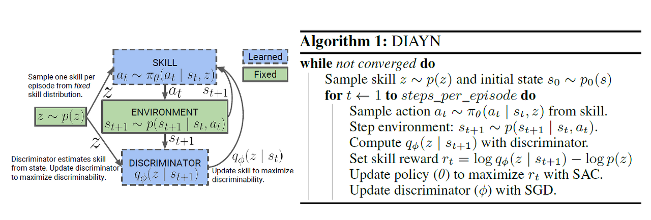 - Agent는 구분하기 쉬운 states를 방문하면 보상을 받는 반면에, discriminator는 방문한 states로부터 skill z를 더 잘 추론하기 위하여 업데이트 된다.