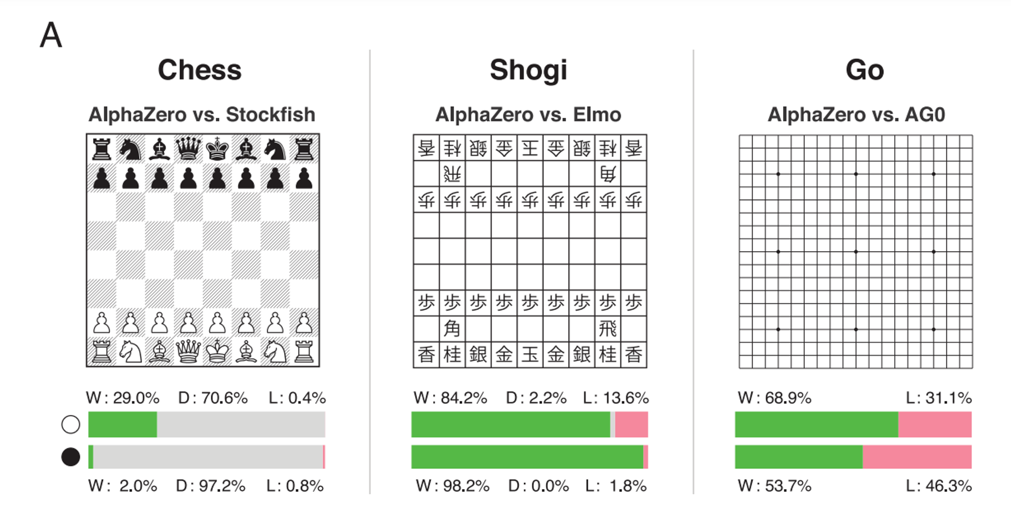 결과적으로 실험을 진행했을 때, AlphaZero를 이용하는 경우 Chess, Shogi, Go 모두에서 높은 승률을 볼 수 있었다고 함.