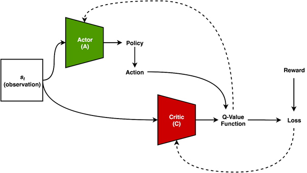 최적의 수렴에서, A는 총 discounted future reward를 최대화하는 polices를 생성할 것으로 기대되며, C는 미래의 좋은 예언자가 될 것을 기대 받는다.